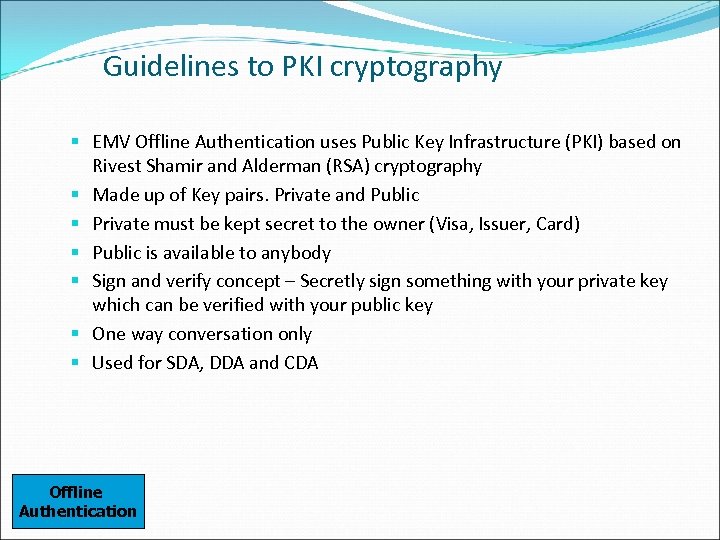 Guidelines to PKI cryptography § EMV Offline Authentication uses Public Key Infrastructure (PKI) based on Rivest Shamir and Alderman (RSA) cryptography § Made up of Key pairs. Private and Public § Private must be kept secret to the owner (Visa, Issuer, Card) § Public is available to anybody § Sign and verify concept – Secretly sign something with your private key which can be verified with your public key § One way conversation only § Used for SDA, DDA and CDA Offline Authentication