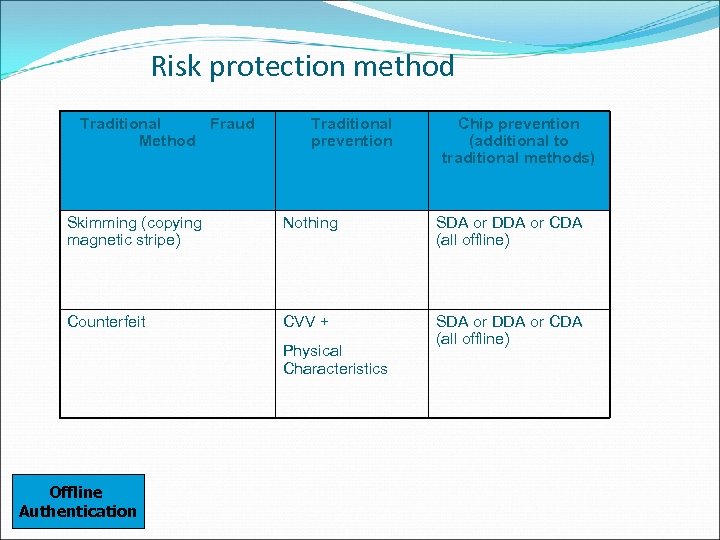 Risk protection method Traditional Fraud Method Traditional prevention Chip prevention (additional to traditional methods) Skimming (copying magnetic stripe) Nothing SDA or DDA or CDA (all offline) Counterfeit CVV + SDA or DDA or CDA (all offline) Physical Characteristics Offline Authentication
