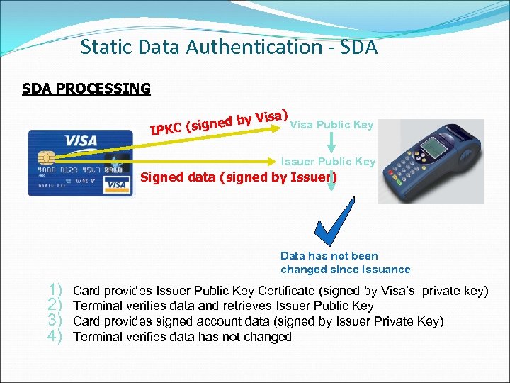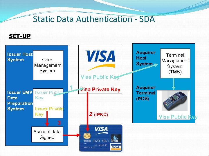 Static Data Authentication - SDA SET-UP Issuer Host System Acquirer Host System Card Management System Visa Public Key Issuer EMV Issuer Public Key Data Preparation Issuer Private System Key 3 Account data Signed 1 Visa Private Key 2 (IPKC) Terminal Management System (TMS) Acquirer Terminal (POS) Visa Public Key