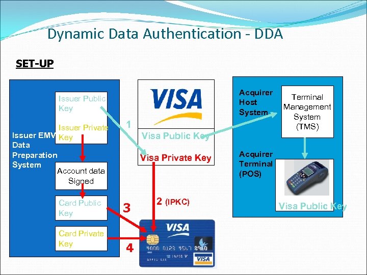 Dynamic Data Authentication - DDA SET-UP Acquirer Host System Issuer Public Key Issuer Private Issuer EMV Key Data Preparation System Account data Signed Card Public Key Card Private Key 1 Visa Public Key Visa Private Key 3 4 2 (IPKC) Terminal Management System (TMS) Acquirer Terminal (POS) Visa Public Key