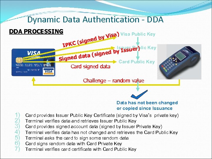 Dynamic Data Authentication - DDA PROCESSING sig ( IPKC sa) Visa Public Key Vi d by ne Issuer Public Key uer) ed by ta (sign a d Signed Card signed data Iss Card Public Key Challenge – random value 1) 2) 3) 4) 5) 6) 7) Data has not been changed or copied since Issuance Card provides Issuer Public Key Certificate (signed by Visa’s private key) Terminal verifies data and retrieves Issuer Public Key Card provides signed account data (signed by Issuer Private Key) Terminal verifies data has not changed and retrieves the Card Public Key Terminal asks the card to sign some random data Card signs random data with Card Private Key Terminal verifies card certificate with Card Public Key