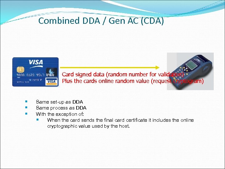 Combined DDA / Gen AC (CDA) Card signed data (random number for validation) Plus the cards online random value (request cryptogram) § § § Same set-up as DDA Same process as DDA With the exception of: § When the card sends the final card certificate it includes the online cryptographic value used by the host.
