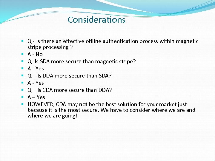 Considerations § Q - Is there an effective offline authentication process within magnetic stripe processing ? § A - No § Q -Is SDA more secure than magnetic stripe? § A - Yes § Q – Is DDA more secure than SDA? § A - Yes § Q – Is CDA more secure than DDA? § A – Yes § HOWEVER, CDA may not be the best solution for your market just because it is the most secure. We have to consider where we are and where we are going!