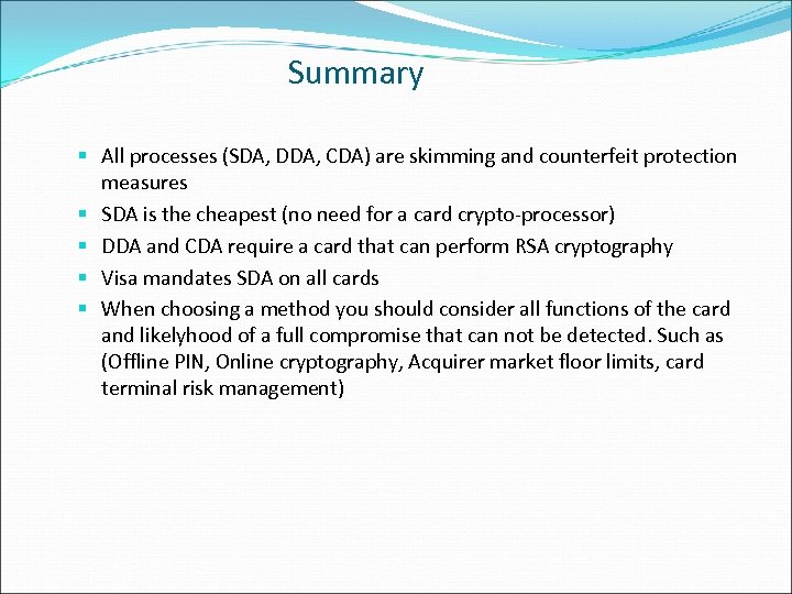 Summary § All processes (SDA, DDA, CDA) are skimming and counterfeit protection measures § SDA is the cheapest (no need for a card crypto-processor) § DDA and CDA require a card that can perform RSA cryptography § Visa mandates SDA on all cards § When choosing a method you should consider all functions of the card and likelyhood of a full compromise that can not be detected. Such as (Offline PIN, Online cryptography, Acquirer market floor limits, card terminal risk management)
