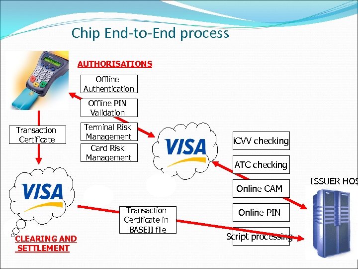 Chip End-to-End process AUTHORISATIONS Offline Authentication Offline PIN Validation Transaction Certificate Terminal Risk Management Card Risk Management i. CVV checking ATC checking Online CAM CLEARING AND SETTLEMENT Transaction Certificate in BASEII file Online PIN Script processing ISSUER HOS