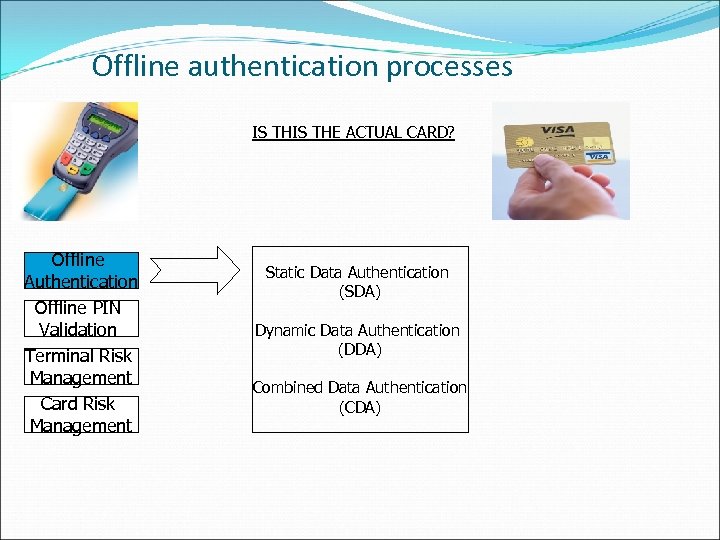 Offline authentication processes IS THE ACTUAL CARD? Offline Authentication Offline PIN Validation Terminal Risk Management Card Risk Management Static Data Authentication (SDA) Dynamic Data Authentication (DDA) Combined Data Authentication (CDA)