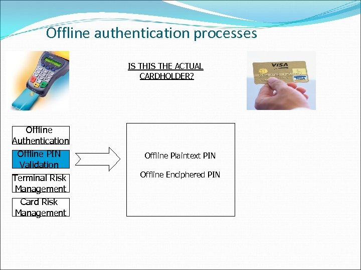 Offline authentication processes IS THE ACTUAL CARDHOLDER? Offline Authentication Offline PIN Validation Terminal Risk Management Card Risk Management Offline Plaintext PIN Offline Enciphered PIN