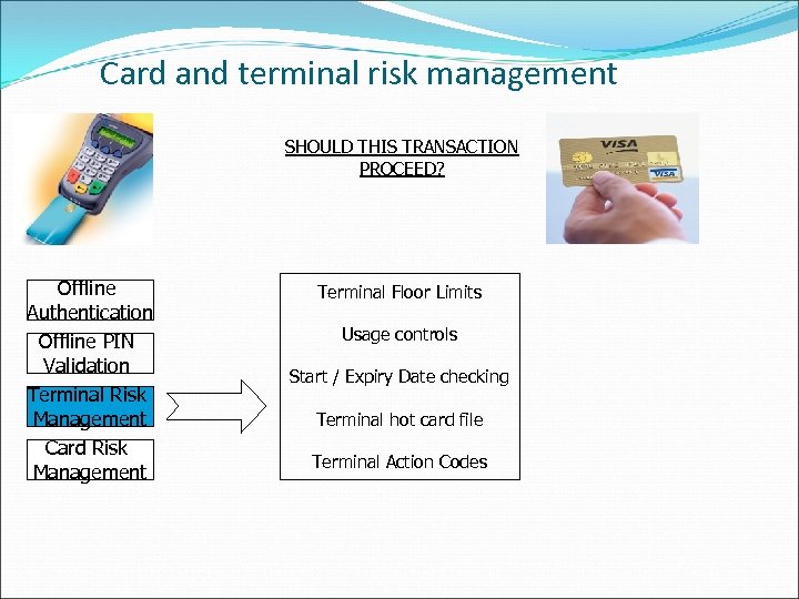 Card and terminal risk management SHOULD THIS TRANSACTION PROCEED? Offline Authentication Offline PIN Validation Terminal Risk Management Card Risk Management Terminal Floor Limits Usage controls Start / Expiry Date checking Terminal hot card file Terminal Action Codes