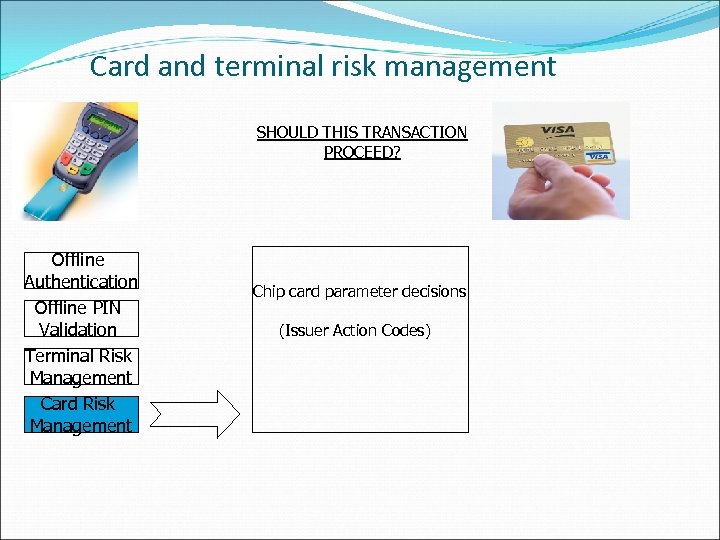 Card and terminal risk management SHOULD THIS TRANSACTION PROCEED? Offline Authentication Offline PIN Validation Terminal Risk Management Card Risk Management Chip card parameter decisions (Issuer Action Codes)