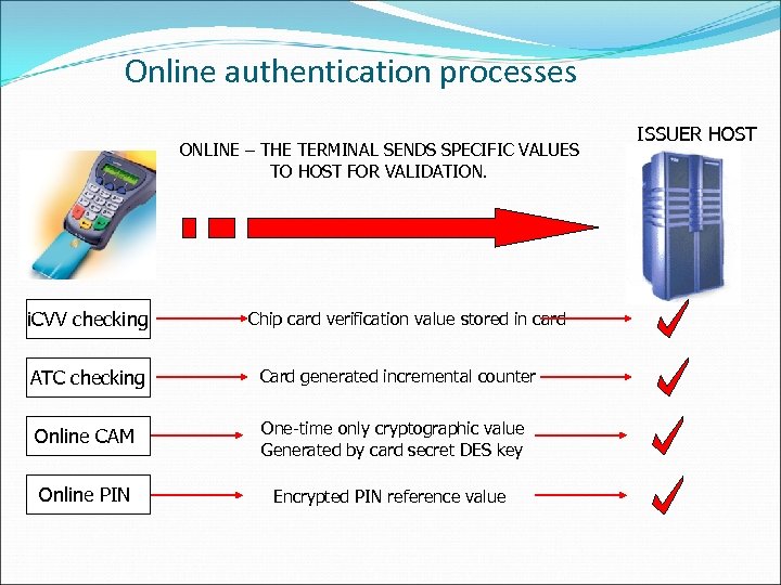 Online authentication processes ONLINE – THE TERMINAL SENDS SPECIFIC VALUES TO HOST FOR VALIDATION. i. CVV checking Chip card verification value stored in card ATC checking Card generated incremental counter Online CAM One-time only cryptographic value Generated by card secret DES key Online PIN Encrypted PIN reference value ISSUER HOST