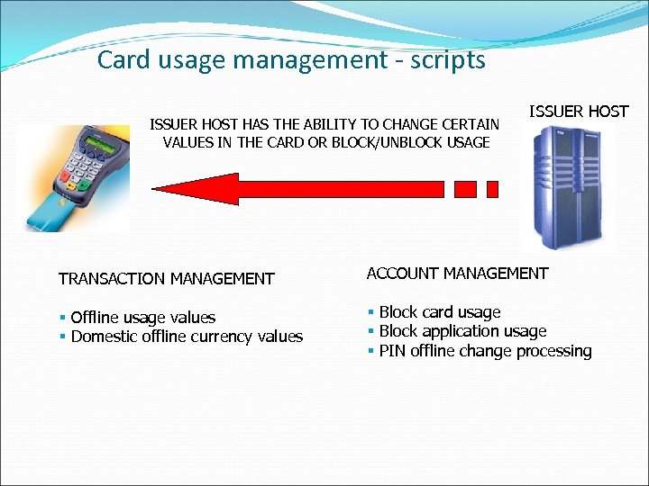 Card usage management - scripts ISSUER HOST HAS THE ABILITY TO CHANGE CERTAIN VALUES IN THE CARD OR BLOCK/UNBLOCK USAGE ISSUER HOST TRANSACTION MANAGEMENT ACCOUNT MANAGEMENT § Offline usage values § Domestic offline currency values § Block card usage § Block application usage § PIN offline change processing