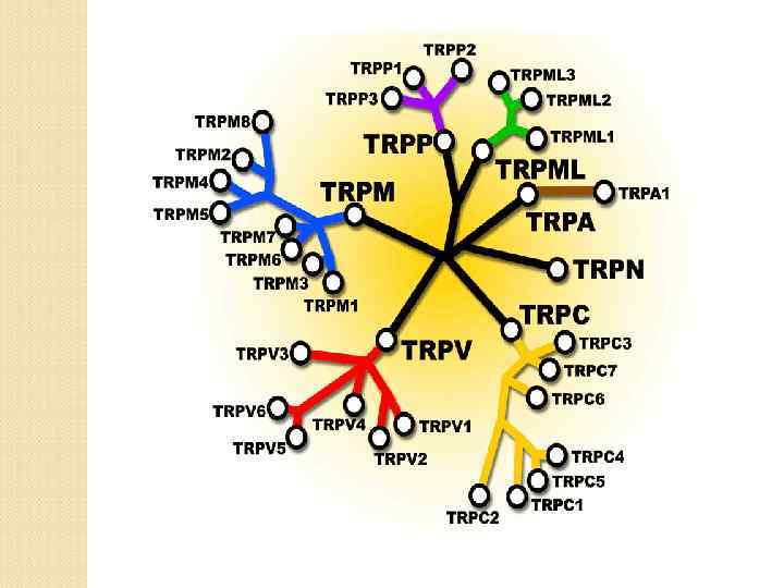 TRP каналы подразделяются на несколько классов: TRPС (canonical) TRPP (polycystin) TRPV (vanilloid) TRPML (mucolipin) TRPM (melastatin) TRPA (ankyrin transmembrane protein) TRP каналы различны по типу ионов, для которых проницаемы: Селективные для Са 2+ Селективные для К+ Неселективные катионные Селективные для Na+ 8