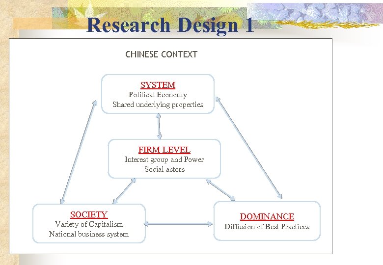 Research Design 1 CHINESE CONTEXT SYSTEM Political Economy Shared underlying properties FIRM LEVEL Interest group and Power Social actors SOCIETY Variety of Capitalism National business system DOMINANCE Diffusion of Best Practices