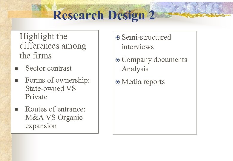 Research Design 2 Highlight the differences among the firms Sector contrast Forms of ownership: State-owned VS Private Routes of entrance: M&A VS Organic expansion Semi-structured interviews Company documents Analysis Media reports