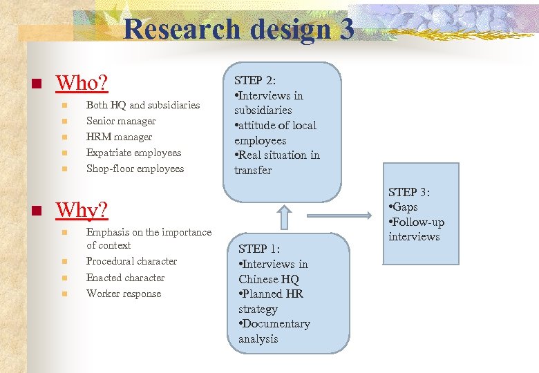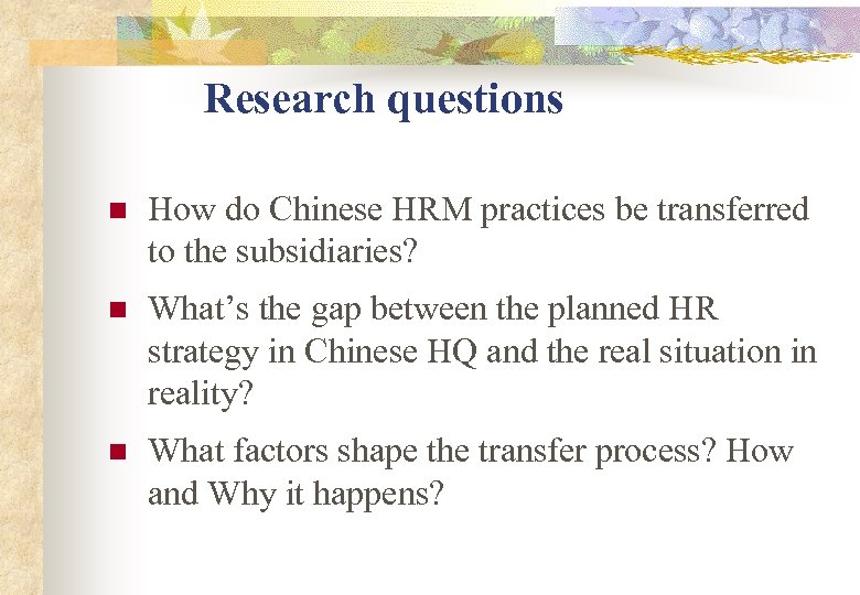 Research questions n How do Chinese HRM practices be transferred to the subsidiaries? n What’s the gap between the planned HR strategy in Chinese HQ and the real situation in reality? n What factors shape the transfer process? How and Why it happens?