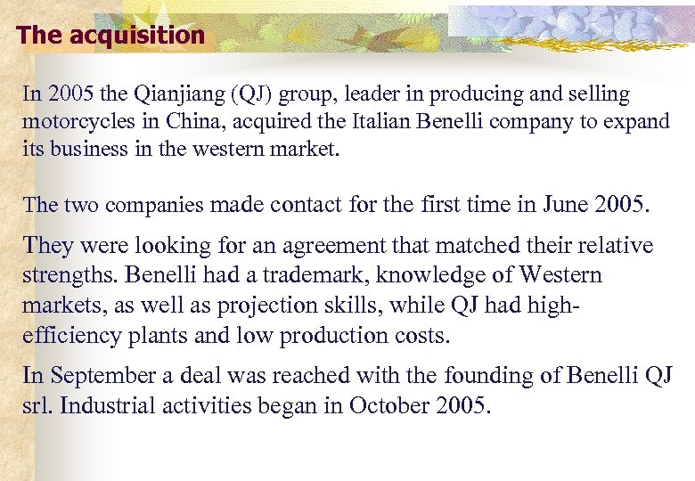 Qianjiang Motorcycle Co. (QJ Group): the acquirer large scale state-owned group producing and selling motorcycles: annual output in China: 1 million units In 2007, produced 1. 2268 million finished motorcycles, among which 1. 2031 million were sold The total assets of QJ: 3. 6 billion RMB, with a total investment of 260 million RMB. Fast international expansion to markets such as Indonesia, Taiwan Austria and Italy