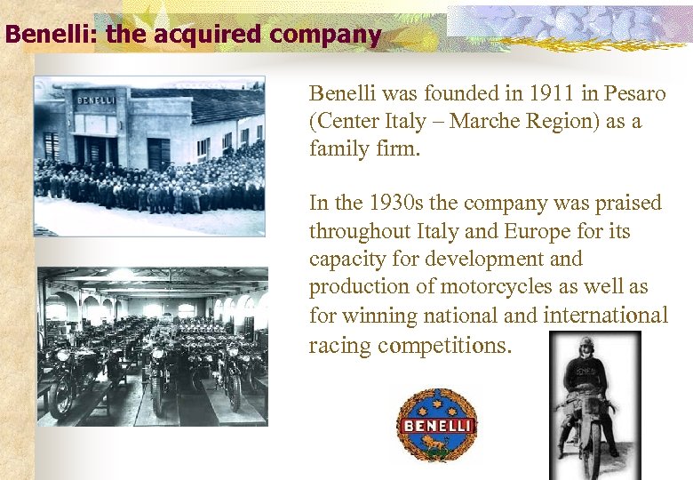 Benelli: the acquired company Benelli was founded in 1911 in Pesaro (Center Italy – Marche Region) as a family firm. In the 1930 s the company was praised throughout Italy and Europe for its capacity for development and production of motorcycles as well as for winning national and international racing competitions.