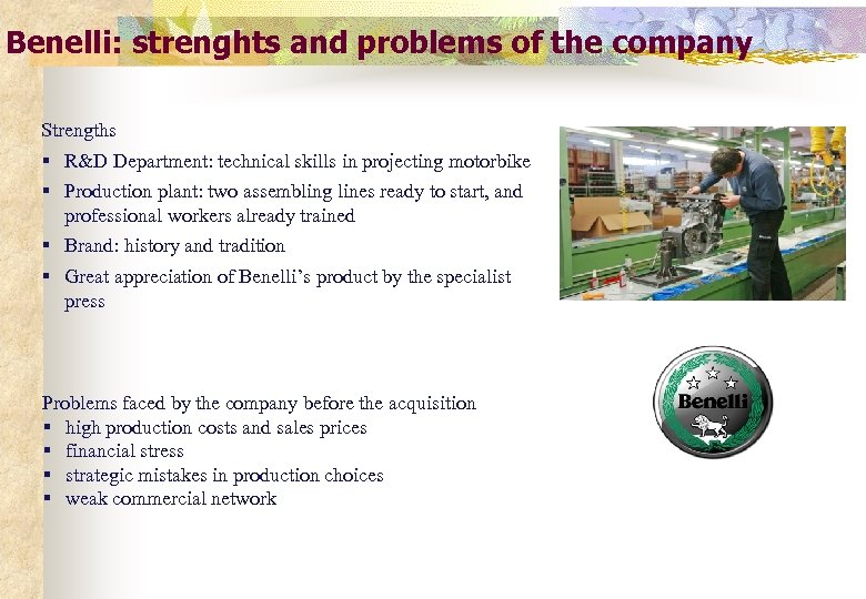 Benelli: strenghts and problems of the company Strengths § R&D Department: technical skills in projecting motorbike § Production plant: two assembling lines ready to start, and professional workers already trained § Brand: history and tradition § Great appreciation of Benelli’s product by the specialist press Problems faced by the company before the acquisition § high production costs and sales prices § financial stress § strategic mistakes in production choices § weak commercial network