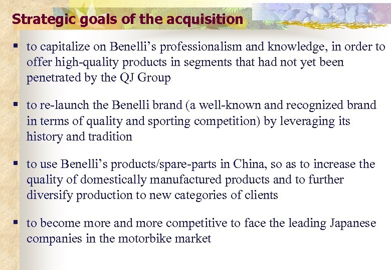 Strategic goals of the acquisition § to capitalize on Benelli’s professionalism and knowledge, in order to offer high-quality products in segments that had not yet been penetrated by the QJ Group § to re-launch the Benelli brand (a well-known and recognized brand in terms of quality and sporting competition) by leveraging its history and tradition § to use Benelli’s products/spare-parts in China, so as to increase the quality of domestically manufactured products and to further diversify production to new categories of clients § to become more and more competitive to face the leading Japanese companies in the motorbike market