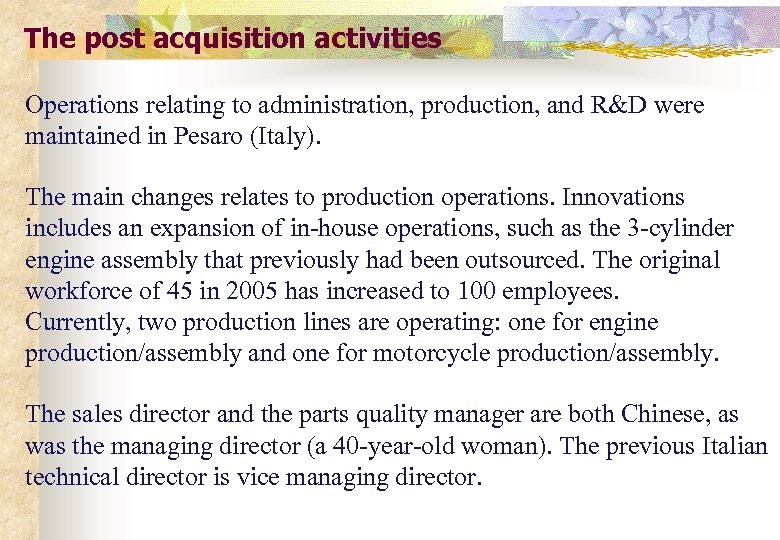 The post acquisition activities Operations relating to administration, production, and R&D were maintained in Pesaro (Italy). The main changes relates to production operations. Innovations includes an expansion of in-house operations, such as the 3 -cylinder engine assembly that previously had been outsourced. The original workforce of 45 in 2005 has increased to 100 employees. Currently, two production lines are operating: one for engine production/assembly and one for motorcycle production/assembly. The sales director and the parts quality manager are both Chinese, as was the managing director (a 40 -year-old woman). The previous Italian technical director is vice managing director.
