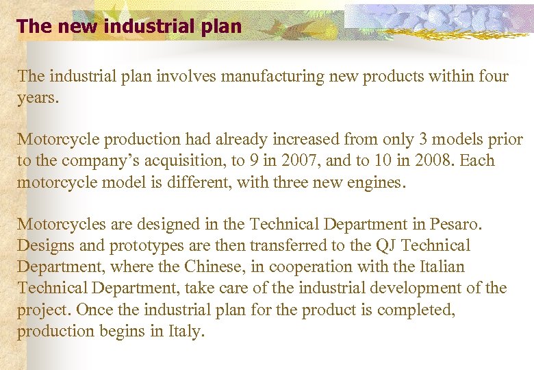 The new industrial plan The industrial plan involves manufacturing new products within four years. Motorcycle production had already increased from only 3 models prior to the company’s acquisition, to 9 in 2007, and to 10 in 2008. Each motorcycle model is different, with three new engines. Motorcycles are designed in the Technical Department in Pesaro. Designs and prototypes are then transferred to the QJ Technical Department, where the Chinese, in cooperation with the Italian Technical Department, take care of the industrial development of the project. Once the industrial plan for the product is completed, production begins in Italy.