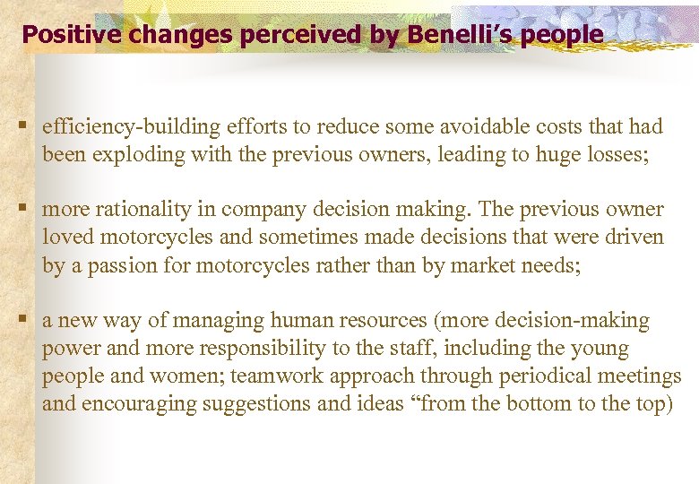 Positive changes perceived by Benelli’s people § efficiency-building efforts to reduce some avoidable costs that had been exploding with the previous owners, leading to huge losses; § more rationality in company decision making. The previous owner loved motorcycles and sometimes made decisions that were driven by a passion for motorcycles rather than by market needs; § a new way of managing human resources (more decision-making power and more responsibility to the staff, including the young people and women; teamwork approach through periodical meetings and encouraging suggestions and ideas “from the bottom to the top)
