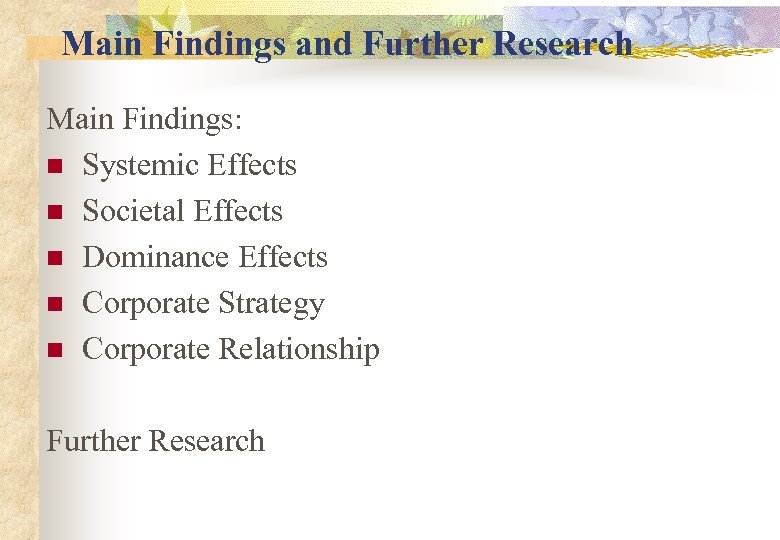 Main Findings and Further Research Main Findings: n Systemic Effects n Societal Effects n Dominance Effects n Corporate Strategy n Corporate Relationship Further Research