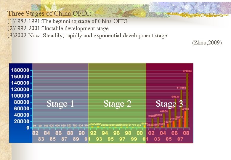 Three Stages of China OFDI: (1)1982 -1991: The beginning stage of China OFDI (2)1992 -2001: Unstable development stage (3)2002 -Now: Steadily, rapidly and exponential development stage (Zhou, 2009) Stage 1 Stage 2 Stage 3