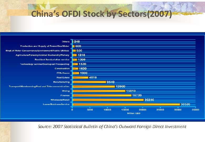 China’s OFDI Stock by Sectors(2007) Source: 2007 Statistical Bulletin of China’s Outward Foreign Direct Investment