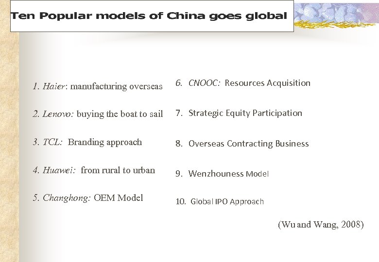 1. Haier: manufacturing overseas 6. CNOOC: Resources Acquisition 2. Lenovo: buying the boat to sail 7. Strategic Equity Participation 3. TCL: Branding approach 8. Overseas Contracting Business 4. Huawei: from rural to urban 9. Wenzhouness Model 5. Changhong: OEM Model 10. Global IPO Approach (Wu and Wang, 2008)