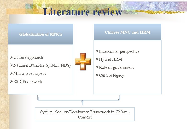 Literature review Globalization of MNCs Chinese MNC and HRM ØLatercomer perspective ØCulture approach ØHybrid HRM ØNational Business System (NBS) ØRole of government ØMicro-level aspect ØCulture legacy ØSSD Framework System–Society-Dominance Framework in Chinese Context