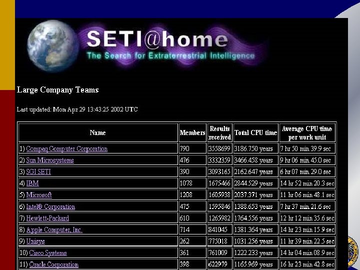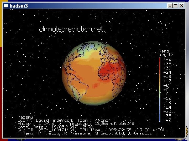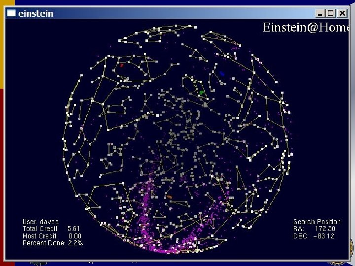 Projects • Astronomy – SETI@home (Berkeley) – Astropulse (Berkeley) – Einstein@home: gravitational pulsar search (Caltech, …) – Planet. Quest (SETI Institute) – Stardust@home (Berkeley, Univ. Washinton, …) • Earth science – Climateprediction. net • (Oxford) Biology/Medicine – Folding@home, Predictor@home (Stanford, Scripts) – Fight. AIDSathome: virtual drug discovery • Physics – LHC@home • (Cern) Other – Web indexing/search – Internet Resource mapping (UC Berkeley)