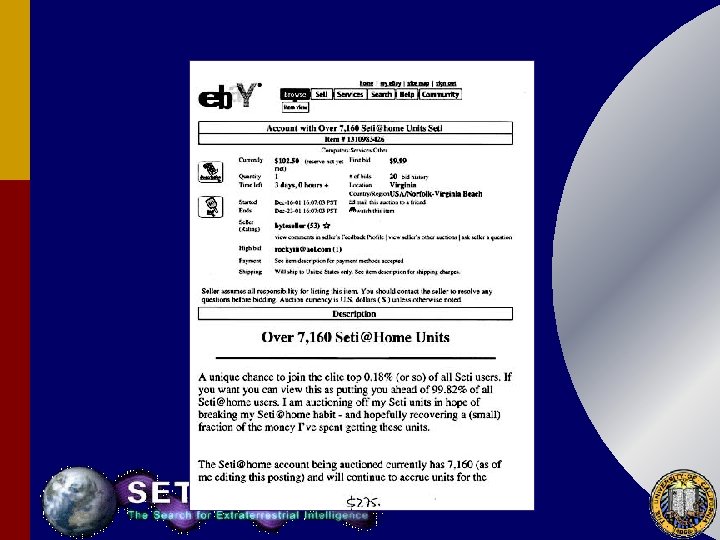 University of California, Berkeley SETI Program • Graduate Students Chen Chang, Pierre Droz, Aaron Parsons, David Purdy • Undergraduate Students Daniel Chapman, Henry Chen, Charlie Conroy, Wonsop Sim • Astronomers, Computer Scientists and Engrs. David Anderson, Bob Bankay, Jeff Cobb, Court Cannick, Eric Korpela, Matt Lebofsky, Jeff Mock, Rom Walton, Dan Werthimer