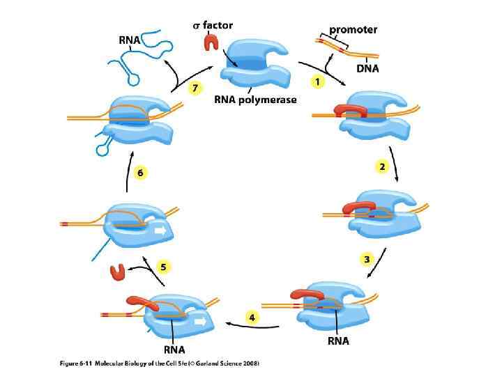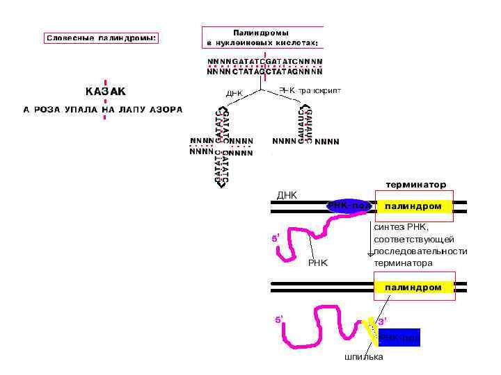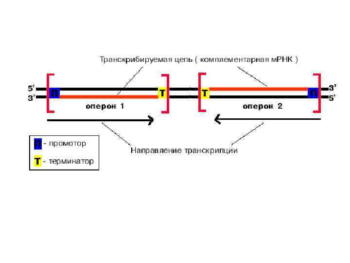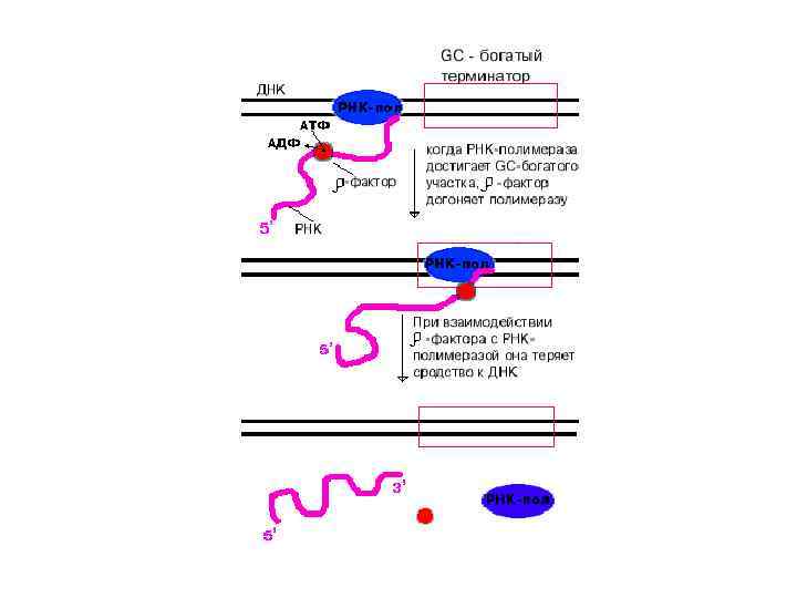 Терминация транскрипции • определяется особой нуклеотидной последовательностью в ДНК, расположенной в зоне терминатора бактериальных оперонов и называемой стоп-сигналом • В стоп сигнале имеется GC богатый участок, обладающий центральной симметрией и представляющий собой самокомплементарную нуклеотидную последовательность