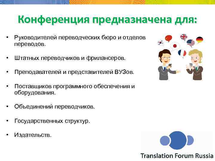 Конференция предназначена для: • Руководителей переводческих бюро и отделов переводов. • Штатных переводчиков и фрилансеров. • Преподавателей и представителей ВУЗов. • Поставщиков программного обеспечения и оборудования. • Объединений переводчиков. • Государственных структур. • Издательств.