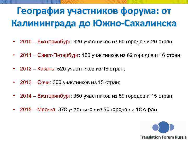 География участников форума: от Калининграда до Южно-Сахалинска • 2010 – Екатеринбург: 320 участников из 60 городов и 20 стран; • 2011 – Санкт-Петербург: 450 участников из 62 городов и 16 стран; • 2012 – Казань: 520 участников из 18 стран; • 2013 – Сочи: 300 участников из 15 стран; • 2014 – Екатеринбург: 350 участников из 59 городов и 15 стран; • 2015 – Москва: 378 участников из 50 городов и 18 стран.