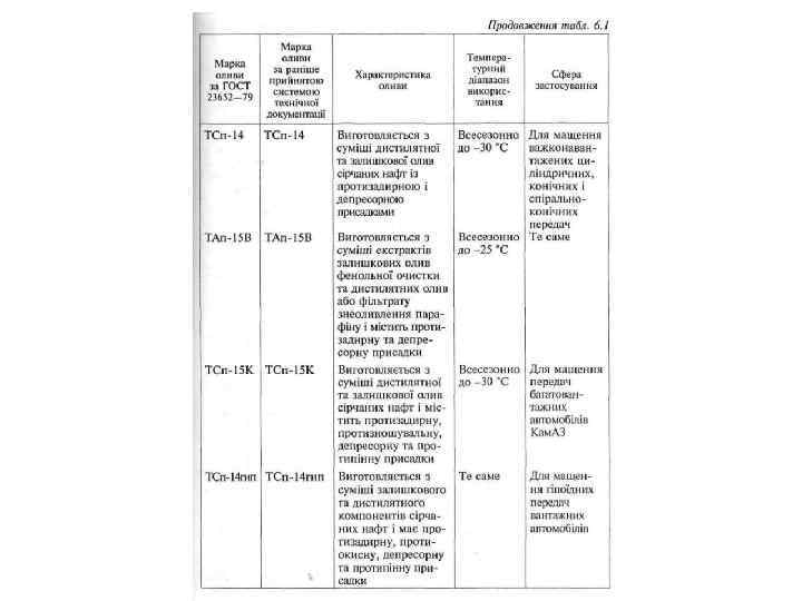Таблиця 6. 1 Характеристика трансмісійних олив і сфера їх застосування