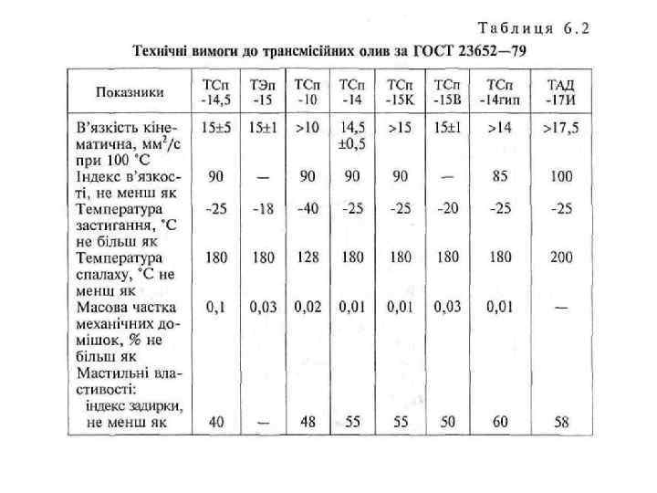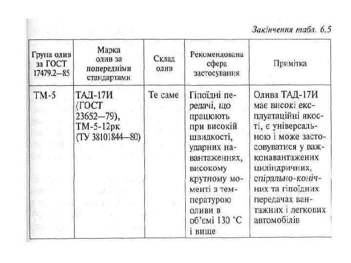Відповідність трансмісійних олив за ГОСТ 17479. 2– 85 оливам за попередніми стандартами та рекомендовану сферу їх застосування наведено в табл. 6. 5. Трансмісійні оливи мають застосовуватись відповідно до інструкції з експлуатації машин. Однак на практиці може виникнути ситуація, коли є потреба змішувати оливи. Як вимушена міра – це допускається (винятком є олива ТСп-9 гип, яка не змішується з іншими оливами). Суміші олив можна використовувати в коробці передач, ведучих мостах і редукторах з негіпоїдними передачами. У гіпоїдних передачах слід застосовувати тільки гіпоїдні оливи. Ці оливи в не-гіпощних передачах можна використовувати без обмежень, тому що вони мають найкращі експлуатаційні якості. Тому олива ТАД-17 И є придатною для всіх вузлів трансмісії легкових автомобілів, крім ВАЗ-2108, ВАЗ-2109. У цих моделяху трансмісії застосовують моторні оливи М-10 Г, И та М-8 Г, И.