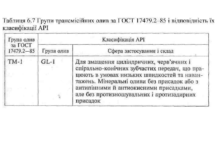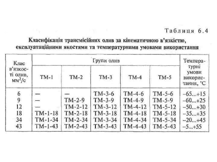 У 1973 р. країни – члени СЕВ запропонували всі трансмісійні оливи поділити на шість класів за їхньою кінематичною в'язкістю (6, 9, 12, 18, 34 і 43 мм 2/с при температурі 100 °С). Крім того, було запропоновано п'ять груп олив (ТМ-1, ТМ-2, ТМ-3, ТМ-4, ТМ-5), виходячи з їхніх експлуатаційних якостей. Згодом у ГОСТ 17479. 2– 85 трансмісійні оливи було класифіковано не на шість класів, а на чотири (табл. 6. 3); за експлуатаційними якостями кількість груп залишилась незмінною (табл. 6. 4).