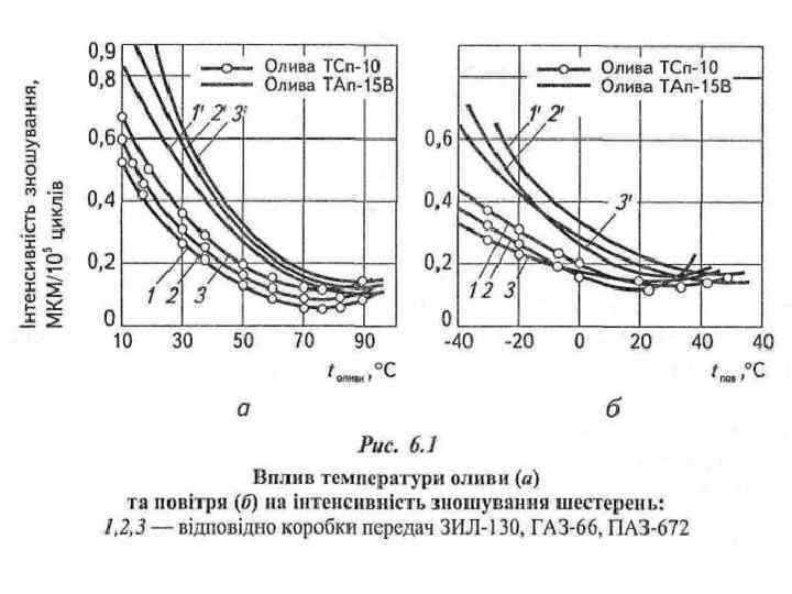 Зубчасті передачі працюють у рідинному, гідродинамічному, ела-стогідродинамічному режимах або в режимі граничної оливи, а найчастіше – одночасно в усіх цих режимах із перевагами режиму граничної оливи. Вплив температури на зношування оливи дуже значний. Так, при зменшенні її температури від +20 до -20 °С інтенсивність зношування шестерень підвищується вдвічі, а до -30 °С – вчетверо. З підвищенням температури зношування оливи сповільнюється і при температурі 70. . . 80 °С (температурі повітря 30. . . 40 °С) стабілізується (рис. 6. 1). Оцінюючи температурний режим роботи оливи в зубчастих передачах, розрізняють мінімальну, максимальну та середньоексплуатаційну температури. Мінімальна температура є характерною для початку роботи передачі після тривалої перерви. Вона дорівнює найнижчій температурі повітря, за якої можна рушати машині з місця.