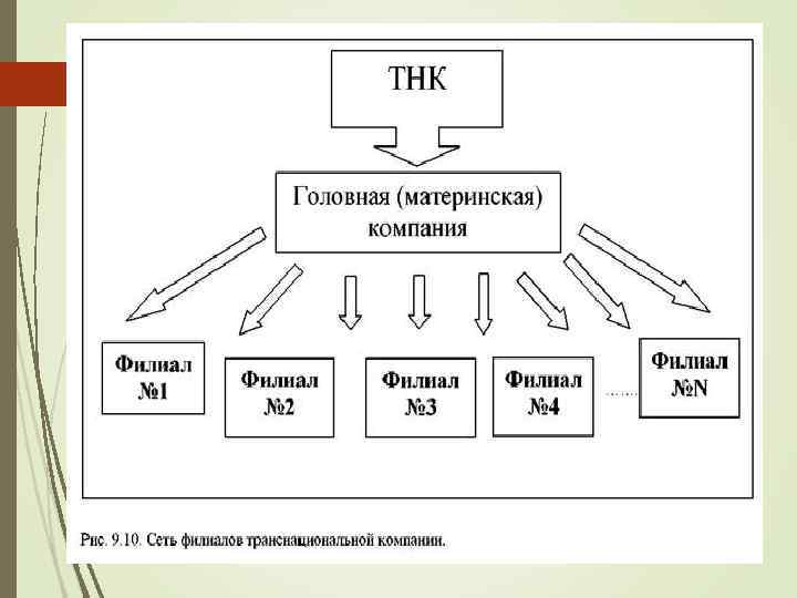 Структура ТНК Дочерняя компания - акционерная компания, более половины голосов акционеров которой принадлежит другой единице, что дает право принимать решения по управлению компанией. Филиал - предприятие, находящееся в полной или совместной собственности в принимающей стране, которое может быть постоянным представительством или офисом иностранного инвестора; или частного предприятия или совместного предприятия между иностранным инвестором и одной или более фирмами; или может быть земельными участками, сооружениями и недвижимостью, принадлежащих зарубежному инвестору за пределами его страны в течение не менее 1 года
