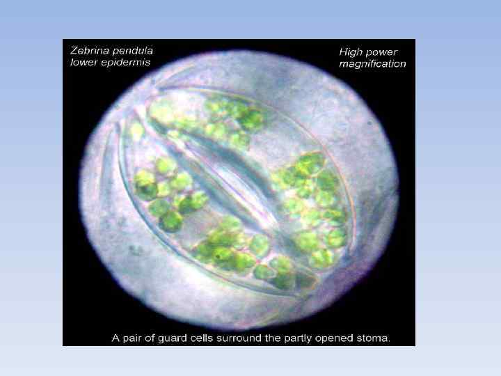 Механізми відкриття і закриття продихів • Гідропасивний під час дощу • Гідроактивний – внаслідок перетікання калію • Фотоактивний продихи закриваються в темноті і відкриваються на світлі. В темноті збільшується вміст СО 2 – знижується р. Н посилюється синтез крохмалю вода відтікає із замикаючих клітин продихи закриваються. На світлі вміст СО 2 зменшується р. Н підвищується – активуються ферменти розкладу крохмалю – збільшується вміст моноцукрів – вода притікає в замикаючі клітини – продихи відкриваються