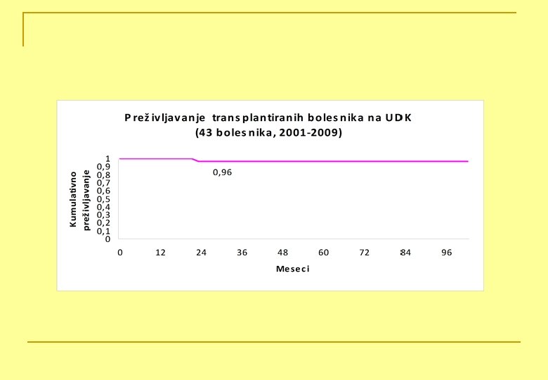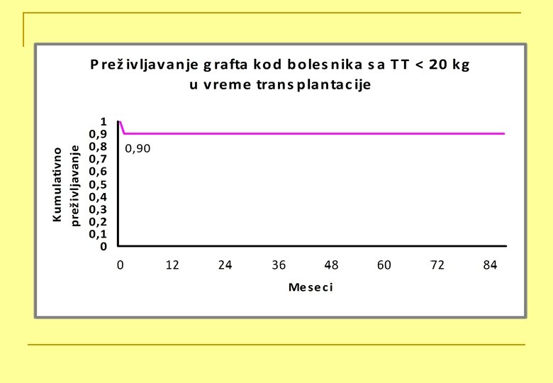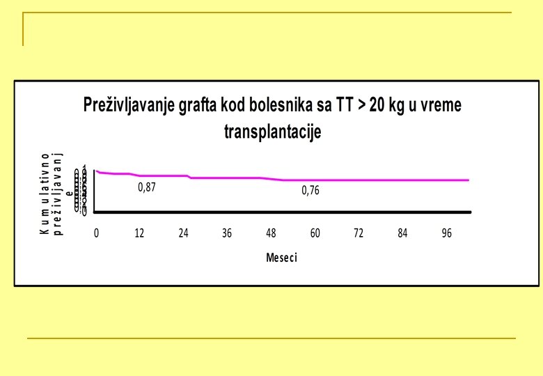 Preživljavanje grafta 1 god-87% 5 god-78% q 5 god. za sve graftove 78% n n 1 god. je 95% a 5 god. 83% za graftove sa živih donora 1 god. je 91% a 5 god. 73% za kadaverične graftove