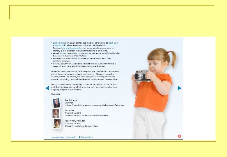 Children's Hospital and Health System Foundation n Gifts to the foundation support the many programs and services for children and families provided through Children's Hospital and Health System member organizations. Your donation can support patient care programs, professional and community education, advocacy for the health and safety of children, and pediatric research. Your gifts support: n Children's Hospital of Wisconsin-Fox Valley. n Children's Health Education Center. n Children's Service Society of Wisconsin. Special fundraising initiatives: n Child Abuse Prevention Fund. n Max Mc. Gee National Research Center for Juvenile Diabetes.