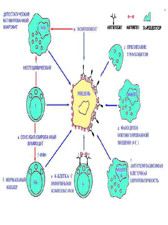 Иммунология отторжения Существуют доказательства того, что отторжение трансплантата связано с действием Т-лимфоцитов, направленным непосредственно и специфически против антигенов донора. Это могут быть цитотоксические клетки (Т- хелперы CD 4 или Тсупрессоры CD 8) или клетки, опосредующие действие ДТН (относятся к классу Т-лимфоциты CD 4). Однако в ранних стадиях процесса отторжения в инфильтрате присутствует значительное число В-лимфоцитов, нольлимфоцитов, естественных клеток-киллеров (NK) и макрофагов; присутствуют также и клетки, способные опосредовать антителозависимую клеточноопосредуемую цитотоксичность (АЗКЦ). Многие из Влимфоцитов продуцируют иммуноглобулины. Спектры клеточного и гуморального ответов и повреждения трансплантата вариабельны и зависят от специфических генетических различий между донором и реципиентом и от степени предсенсибилизации. Чем больше степень предсенсибилизации, тем более вероятно, что будут обнаружены опосредуемые через антитела поражения сосудов. Ориентиром оценки реакции на аллотрансплантат, єфффективности лечения и прогнозирования служит биопсийное исследование трансплантата.