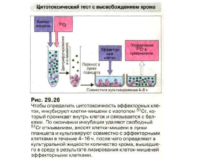 Методы диагностики • Реакция клеточной цитотоксичности. При совместном культивировании лимфоцитов реципиента (отвечающих клеток) и отличающихся от них по антигенам HLA класса II стимулирующих клеток среди отвечающих клеток появляются цитотксические Т-лимфоциты. Они способны разрушать клеткимишени, несущие антигены, которые присутствуют на стимулирующих клетках. • Изучение клеточной цитотоксичности в смешанной культуре лимфоцитов в ряде случаев позволяет предсказать, будет трансплантат стимулировать образование цитотоксических Тлимфоцитов или нет. • Для этого готовится смешанная культура лимфоцитов, где отвечающими клетками служат лимфоциты реципиента, а стимулирующими - инактивированные лимфоциты донора. • После 6 суток инкубации смешанной культуре лимфоцитов к отвечающим клеткам добавляют свежие клетки того же донора, меченные 51 Cr.