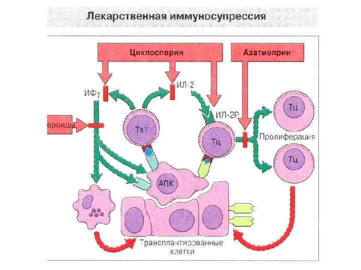 Иммунносупрессивная терапия • Иммунодепрессивные препараты (иммуносупрессоры, иммунодепрессанты): азатиоприн, антилимфолин-Кр, батриден, кризанол, циклоспорин, ауранофин, глюкокортикоиды, микофеноловая кислота и др.