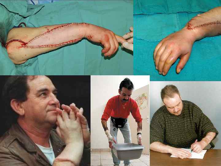 Пациент 1, Matt Scott 37 лет(на момент операции) Потерял свою левую руку в Декабре 1985, из-за взорвавшейся в руке питарды Инструктор младшего медицинского персонала 13 лет использовал протез Оtto – Bock Общее состояние здоровья отличное, несмотря на наличие СД 2, с 1988 года Операция произведена в Январе 1999 в США Иммуносупрессия: Индукция Tacrolimus+MMF+Prednisone, поддерживающая: ММF+Tacrolimus 3 эпизода отторжения в течении первого года, все купировались коротким курсом стероидов. Осложнения: ЦМВ в 3 месяца, приступ желчекаменной болезни Двигательная функция восстанавливалась с 1 ого по 6 ой год и продолжает восстанавливаться Чувствительность продолжает восстанавливаться по сей день, он способен отличать холодное отгорячего, гладкое от шероховатого и даже может ловить и кидать бейсбольный мяч. Carroll test 73
