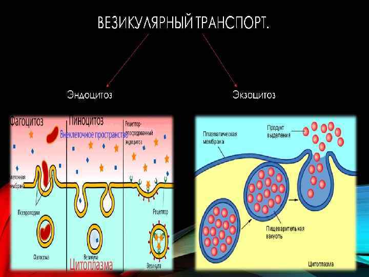 Транспорт через плазматическую макромолекул, их комплексов и частиц внутрь клетки и из нее происходит посредством везикулярного переноса, который можно разделить на 2 вида: • экзоцитоз; • эндоцитоз Эндоцитоз - процесс поглощения макромолекул клеткой. При эндоцитозе плазматическая мембрана образует впячивание, края ее сливаются, и происходит отшнуровывание в цитоплазму везикул – эндоцитарных вакуолей. Экзоцитоз - процесс выведения различных веществ из клетки. Содержимое везикулы выводится за пределы летки, а ее мембрана включается в состав плазмалеммы.