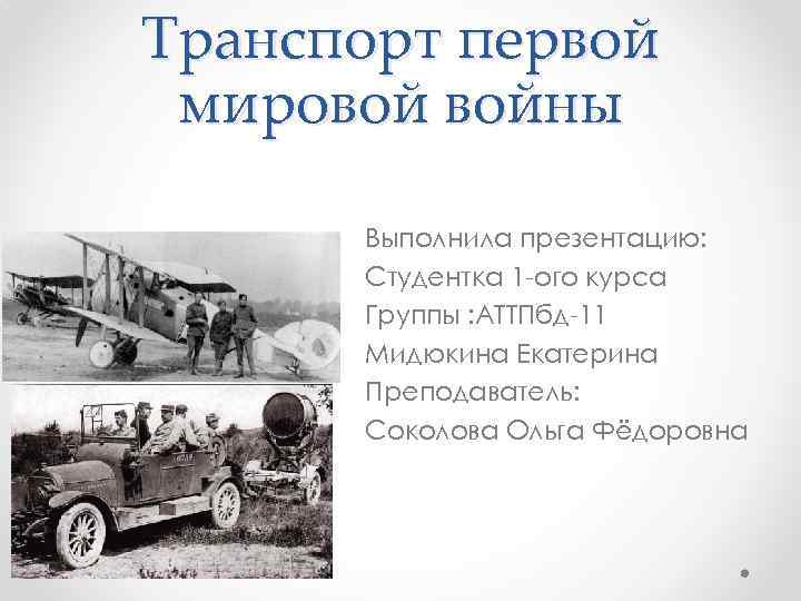 Транспорт первой мировой войны • • • Выполнила презентацию: Студентка 1 -ого курса Группы : АТТПбд-11 Мидюкина Екатерина Преподаватель: Соколова Ольга Фёдоровна
